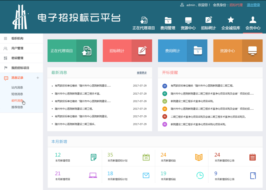 2、招標代理業務功能:招標代理根據項目情況制定招標文件發布招標公告,組織開標評標等業務活動;